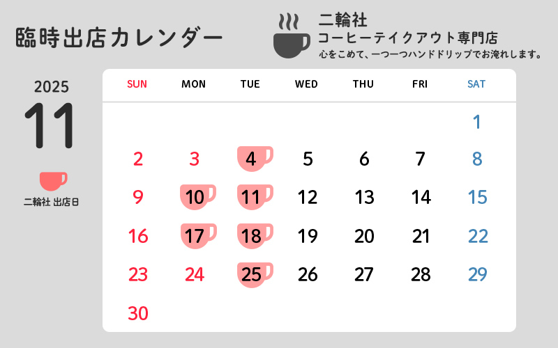 | 11月の出店予定日 | 4日(火) 10日(月)、11日(火) 17日(月)、18日(火) 25日(火) |